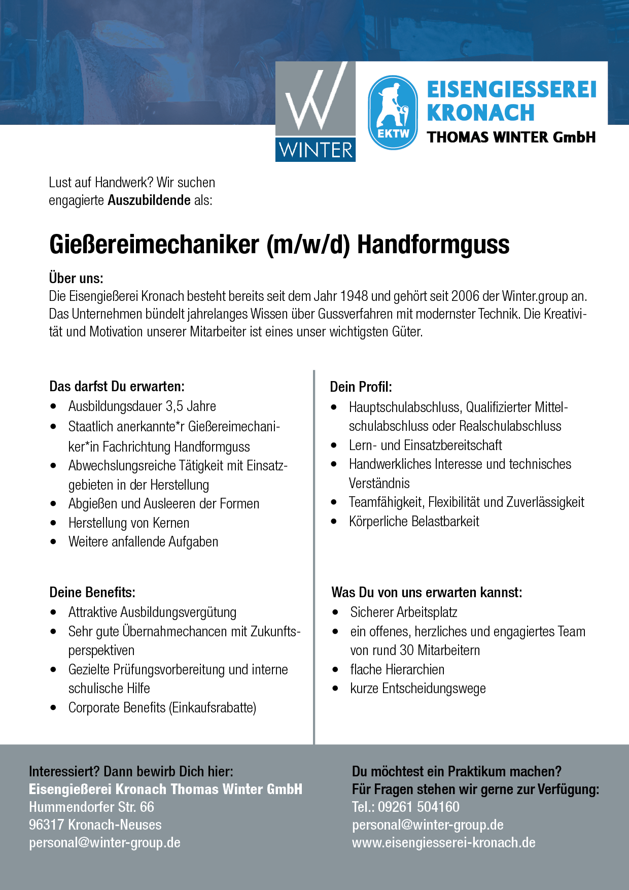 • Ausbildungsdauer 3,5 Jahre• Staatlich anerkannter Gießereimechanikerin Fachrichtung Handformguss
