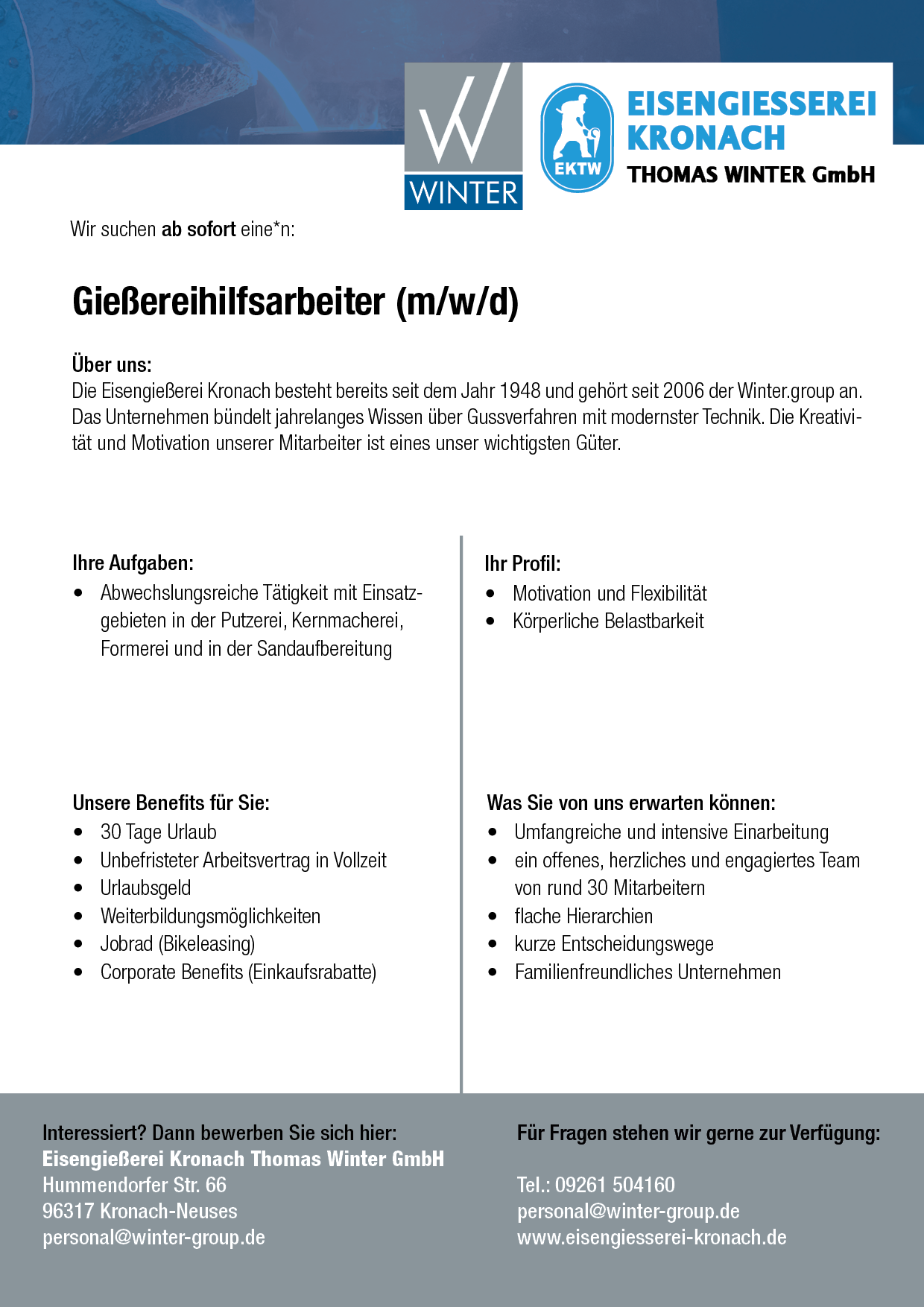 • Abwechslungsreiche Tätigkeit mit Einsatzgebieten in der Putzerei, Kernmacherei, Formerei und in der SandaufbereitungIhr Profil